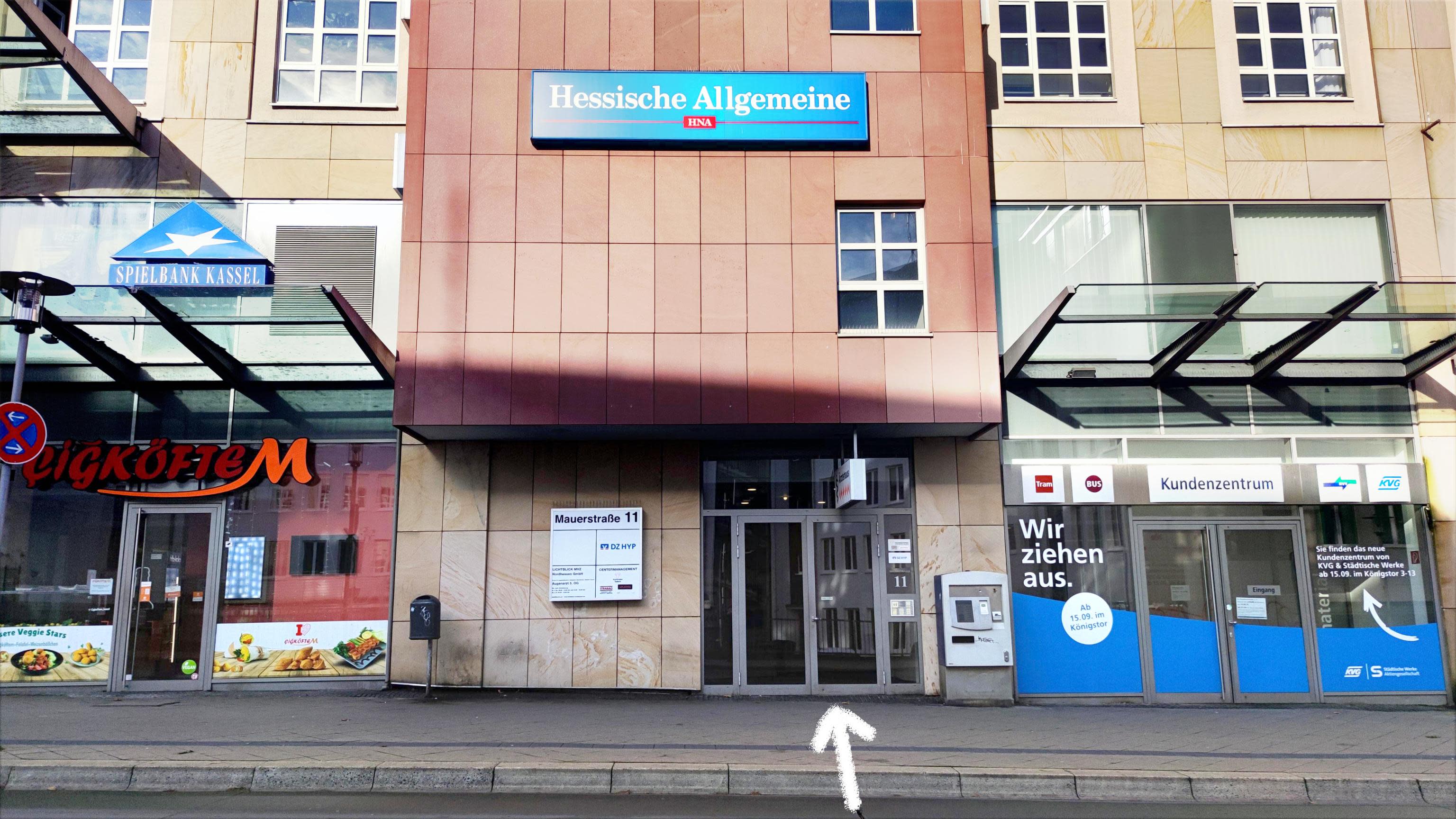 Unsere Räume sind im 5. Stock der Mauerstraße 11 in Kassel. Unsere Eingangstür ist zwischen dem Çiğ Köfte Laden und dem NVV Kundenzentrum. Über der Tür steht groß "Ärztehaus". Die Haustür ist schwer und hat keinen automatischen Türöffner. Wenn du 3mal kurz hintereinander klingelst, kommt eine Person nach unten, und öffnet die Haustür. Abends und am Wochenende musst du klingeln, um ins Haus zu kommen. Die Klingel ist rechts neben der Tür.